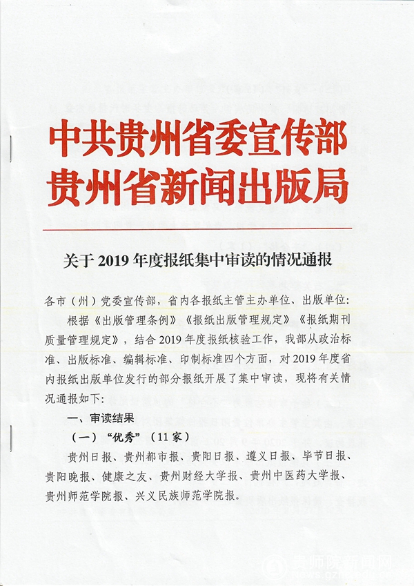 本网讯 近日,中共贵州省委宣传部、贵州省新闻出版局公布2019年度贵州省报纸集中审读情况,《伟德bv国际体育报》获“优秀”等次。