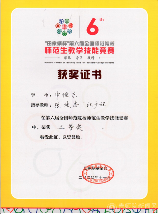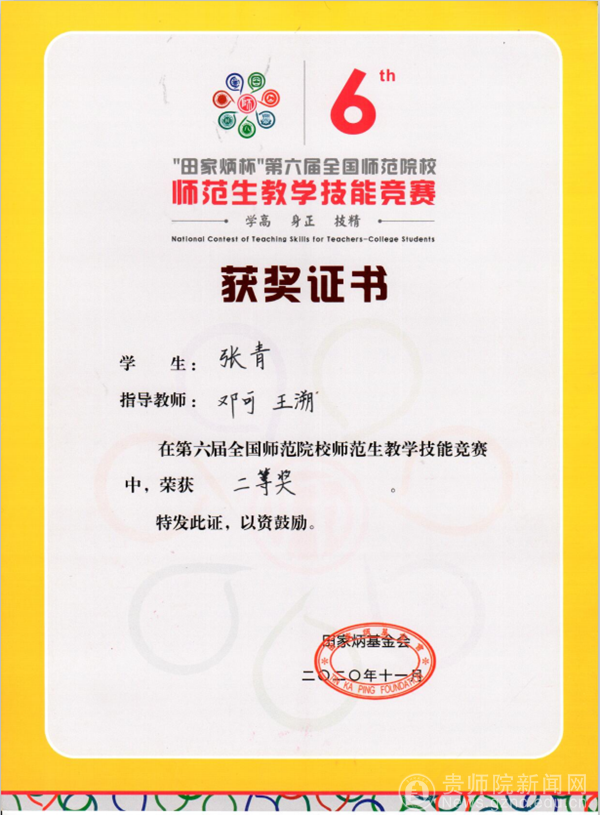 本网讯 11月20日,“田家炳杯”第六届全国师范院校师范生教学技能竞赛决赛在浙江师范大学落下帷幕,伟德官网生物科学学院2017级张青同学代表伟德bv国际体育参加现场决赛荣获二等奖,数学与大数据学院2017级申恒东同学荣获三等奖。
