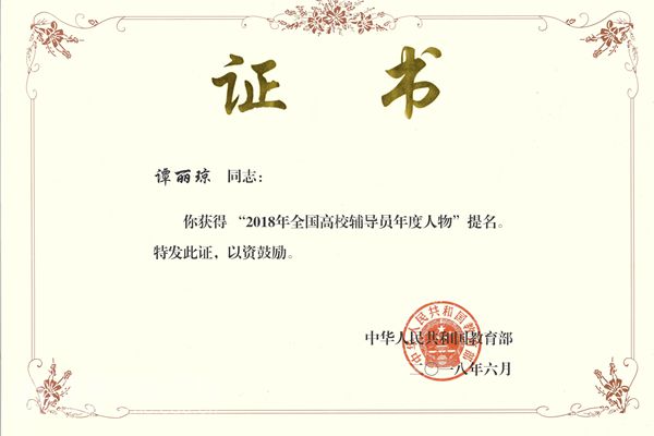 伟德官网谭丽琼老师荣获“2018年全国高校辅导员年度人物”提名奖。