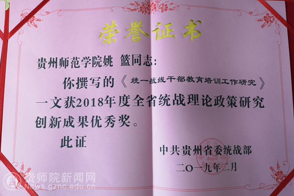本网讯 近日,中共贵州省委统战部通报表彰2018年度全省统战理论政策研究工作先进单位和优秀个人及创新成果。全省各市州党委统战部、理论研究基地和省内高校等五十多家单位参加了此次活动,有六个单位获得表彰。