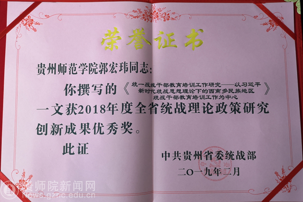在2018年全省统战政策理论研究工作中,伟德官网党委统战部荣获统战理论政策研究创新成果组织奖。同时,伟德官网刘大泯同志撰写的《以习近平新时代中国特色社会主义思想为指导建立中国特色的统一战线理论》、姚篮同志撰写的《统一战线干部教育培训工作研究》、郭宏玮同志撰写的《统一战线干部教育培训工作研究——以习近平新时代统战思想理论下的西南多民族地区统战干部教育培训工作为中心》获统战理论政策研究创新成果优秀奖。