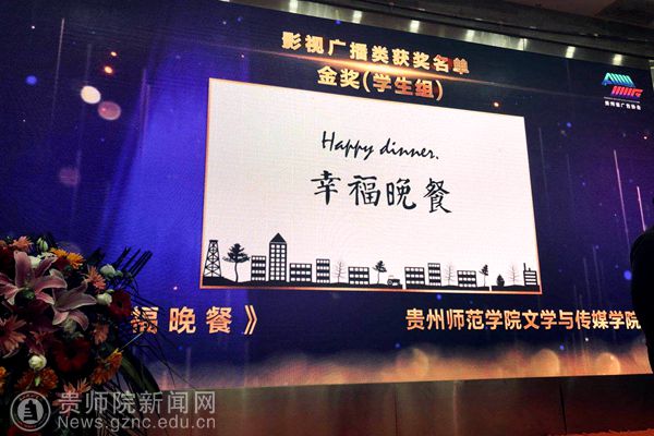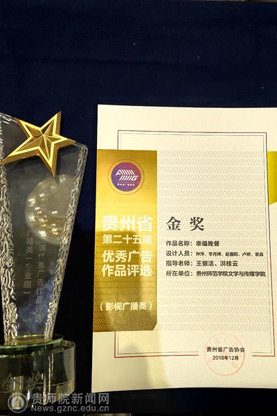 本网讯 近日,在举办的贵州省第二十五届优秀广告作品评选的颁奖典礼中,影视广播类学生组获奖名单正式公布,伟德bv国际体育文学与传媒学院参赛作品《幸福晚餐》(作者:李月婵、赵鑫阳、钟萍、卢娇、袁淼;指导老师:洪桂云、王银洁)获得视频类金奖;《你是我的荣耀》(作者:陈豪;指导老师:潘源)获得视频类银奖;《日行一善,善行一生》(作者:郑超、杨颖、张雷、刘璐萌、王程璐;指导老师:娄立原),《触电后的事》(作者:杨健、张园、武铭洁;指导老师:娄立原)获得视频类铜奖;平面广告类学生组参赛作品《国之传承系列》(作者:钟倩倩;指导老师:娄立原)获得平面类银奖;其优秀作品奖获得十二项,在此次优秀广告作品评选中喜获佳绩。