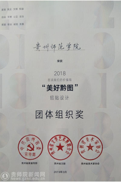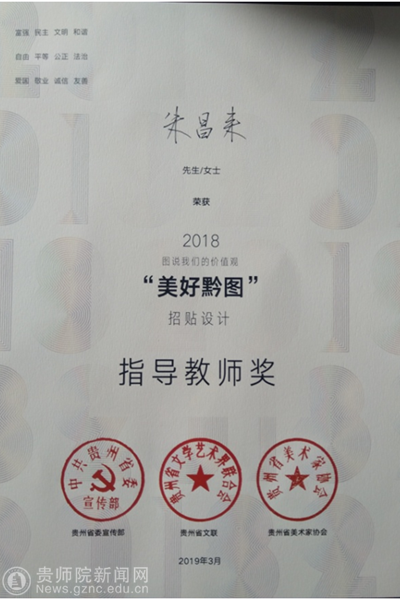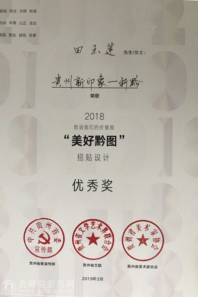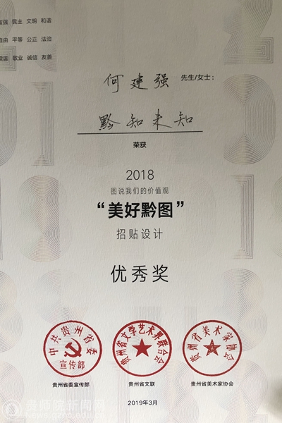 本网讯 近日,由省委宣传部、省文联、省美术家协会组织的第四届“图说我们的价值观·美好黔图”公益广告设计征集活动。美术与设计学院组织了2018级产品设计专业、2016级视觉传达设计班参加。经过专家严格初评与复评,评审出一等奖1名,二等奖2名、三等奖3名,特别奖1名,优秀奖30名,优秀团体组织奖1名,优秀指导教师奖2名。其中,伟德bv国际体育荣获团体组织奖,朱昌来荣获指导教师奖。2016级视觉传达班周定燕同学系列作品《美好黔途》荣获三等奖,何建强同学系列作品《黔知未知》、田玉莲系列作品《贵州新印象》荣获优秀奖;参赛作品表现形式丰富,突出时代性,运用现代艺术手段,增强传播力和感染力,主题鲜明、创意新颖、通俗直观、生动感人。