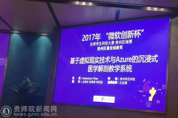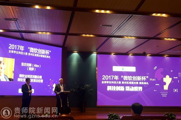 本网讯  近日,2017年“微软创新杯”全球学生科技大赛贵州区域赛决赛颁奖典礼在贵安新区大学城举行,外国语学院团委书记罗荣、辅导员冯康组织了五十名同学,前往参加观摩了颁奖典礼。