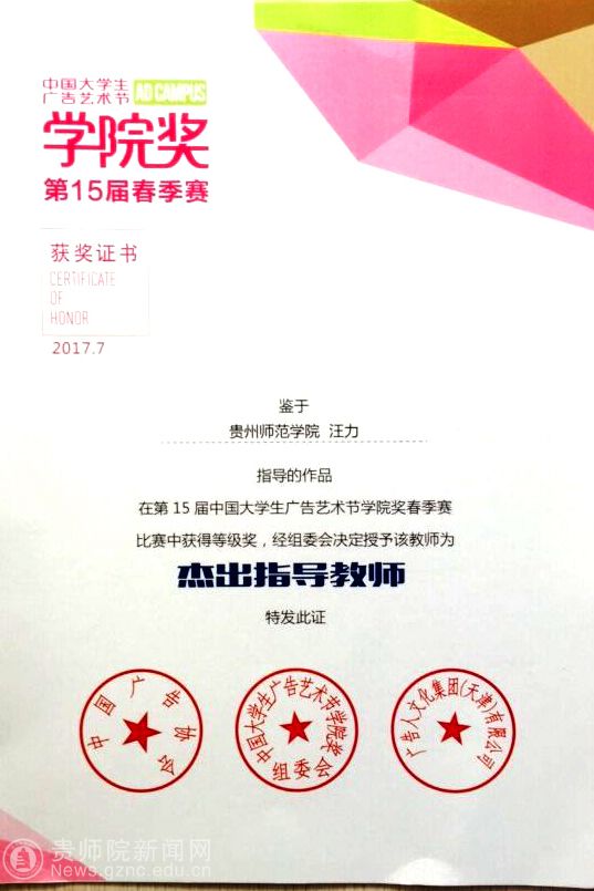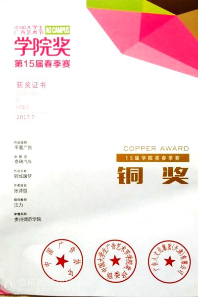 本网讯 在刚刚圆满落下帷幕的第十五届“中国大学生广告艺术节”春季赛中,伟德官网设计学院16级数字媒体艺术专业学生获得“铜奖一项,佳作奖三项”、汪力老师获得“杰出指导教师”奖。