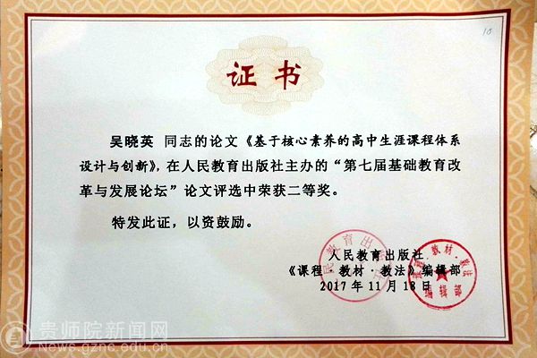 本网讯 为探讨我国基础教育学生发展核心素养的落地问题,由“人民教育出版社课程教材研究所”主办,“厦门市教育科学研究院、《课程·教材·教法》编辑部”承办,“福建省厦门第一中学、福建省厦门实验小学、中国教育学会教育学分会”协办的“第七届基础教育改革与发展论坛”年会于11月17至19日在厦门市如期举行。伟德官网吴晓英博士受邀参加了本次论坛,其参会论文《基于核心素养的高中生涯课程体系设计与创新》在论文评选中喜获二等奖。