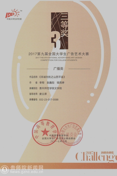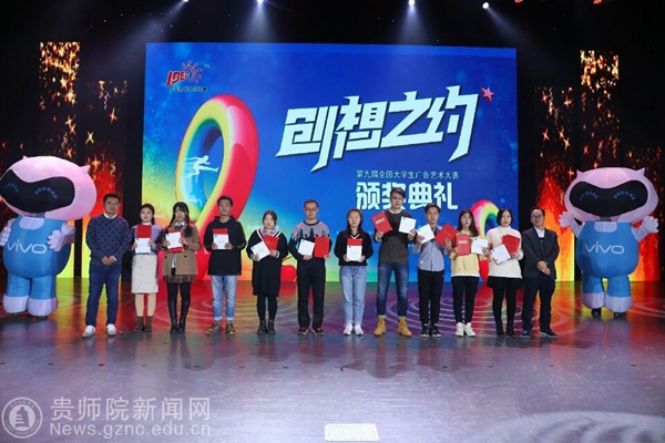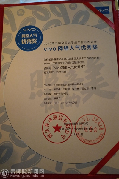 第九届大广赛主题口号为“创意我挑战”,共有1301所高校(2819所学院)参赛,参赛学生超过80万。经校级初选后,共收到作品173870组(约36万件)。经过三个月的省级评选、全国评审、网上公示,最终优中选优产生全国等级奖。伟德官网文学院共有两件作品获得国家级奖项,其中张敏同学创作的广播作品《告白》(指导老师:龙红莲、潘源)获得全国二等奖,李翔、赵鑫阳、钱雨婷同学创作的广播作品《非诚勿扰之山西平遥》(指导老师:娄立原)获得全国三等奖。本届大广赛的优秀作品在爱奇艺、中国广告网开展了“最佳网络人气奖”评选,共产生16名获奖者。伟德官网文学院学生斩获两项vivo最佳网络人气奖。获奖学生代表张敏、李翔、王国伟、涂朝耀上台领取了奖品和证书。本届获奖成绩是伟德官网在该赛事中的最好成绩,也是贵州赛区作品在全国总决赛中的最好成绩。