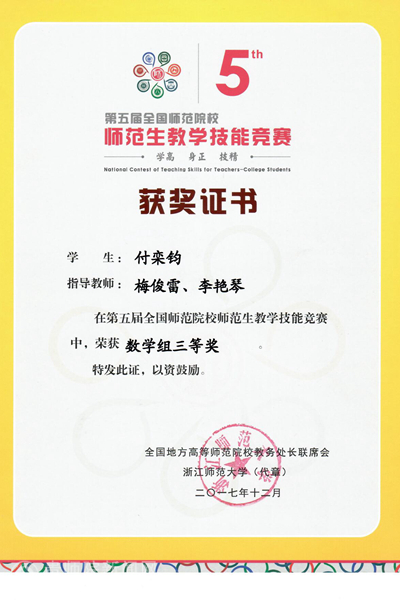 本网讯 12月9日,由全国地方高等师范院校教务处长联席会主办、浙江师范大学承办的第五届全国师范院校师范生教学技能竞赛圆满落下帷幕。伟德官网外国语学院王荟宇荣获二等奖,数计学院付栾钧、化生学院罗姣荣获三等奖。