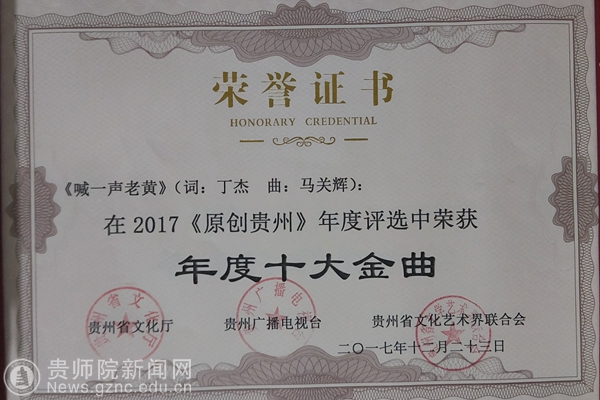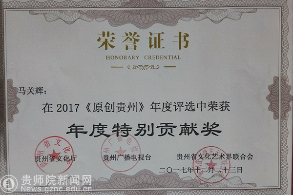 贵州音乐界专家联合音乐先锋榜全国24家成员台对2017参选的作品和歌手进行了评选,最终角逐出“年度最佳男歌手”、“年度最佳女歌手”、“年度十大金曲”、“年度新人”、“听众最喜爱歌手”、“年度特别贡献奖”六大奖项。获奖音乐人不乏省内知名的优秀歌手,他们每一位都各具亮点,演唱的作品都是动人心弦,受到专家老师的高度评价。其中,伟德官网艺术学院院长马关辉教授获年度特别贡献奖,《喊一声老黄》、《石门赋》、《山那边》、《月光》等歌曲荣获“年度十大金曲”。