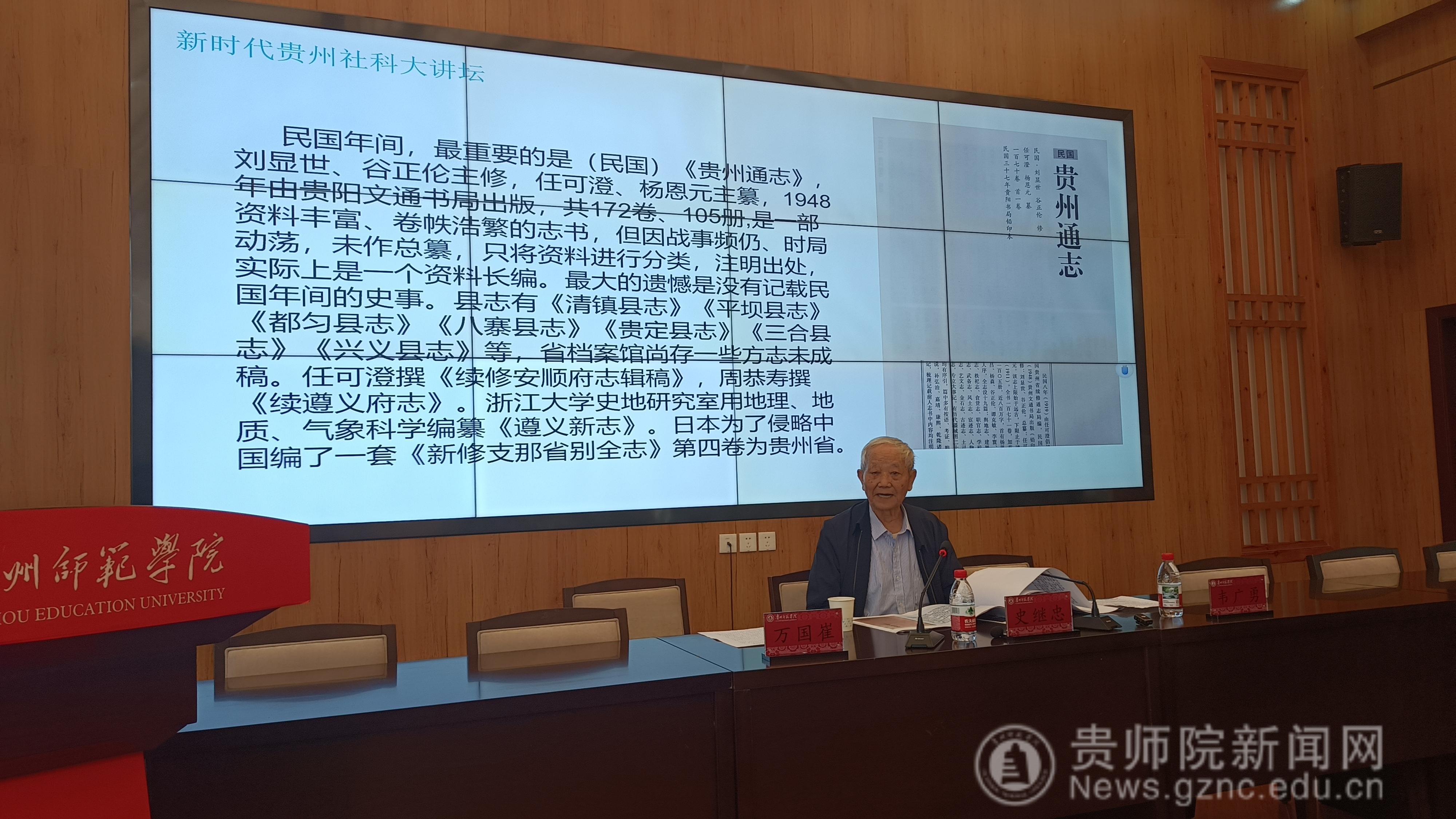 讲座伊始,史继忠强调,修志是中华民族优秀的文化传统,延续两千余年。志书记载各级行政区的自然、政治、经济、文化、社会的情况,具有存史、资治、教化的功能。以1949年为界,中华人民共和国成立前、后编修的志书统称为旧、新志。随后,他逐一列出旧志,并解析其撰写特点。他说,晋人常璩所纂的《华阳国志》是西南地区最早的方志,现存最早的省志是明(弘治)《贵州图经新志》。明(嘉靖)《贵州通志》在图之后分为十二卷,以事为经分为十个门类。明万历《贵州通志》不失为“黔中善本”。明(万历)《黔记》乃万历时贵州巡抚郭子章私纂,是明代最为宏富的一部省志。清代有(康熙)《贵州通志》、(乾隆)《贵州通志》,收入《四库全书》。《遵义府志》被梁启超称为“府志中第一”。生动的方志撰写故事和现实的案例分析,使抽象的贵州方志精神变得具体而生动。在比较新志与旧志的特点时,他说,新志继承修志的体例和基本原则,在篇目和内容上多有改变。一言以蔽之,新志与旧志纲目体制上的差异,主要表现在时代变迁、科学发展。